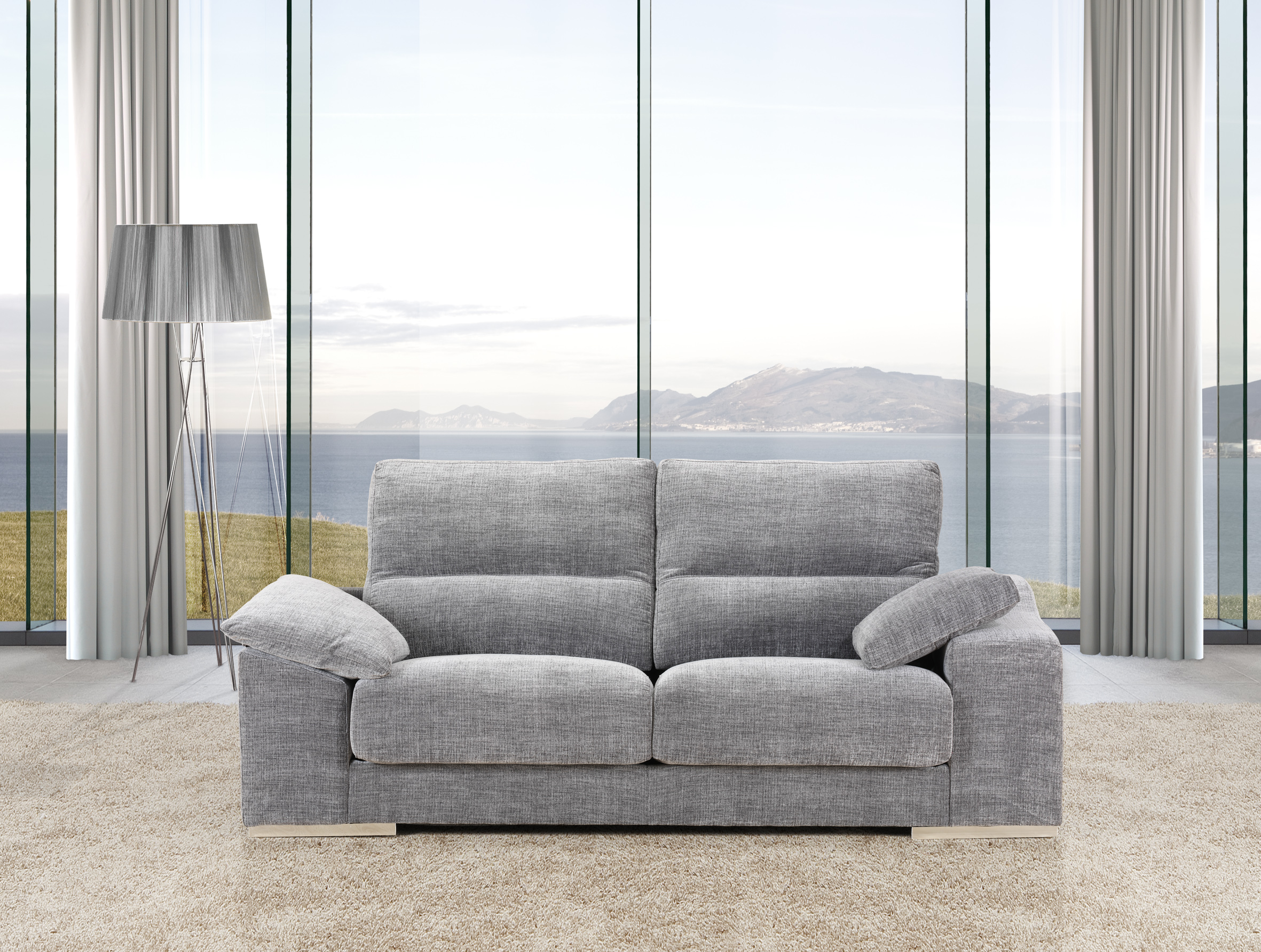 Sofá con 2 asientos a elegir de 2, 3 ó 4 plazas, sentada de fibra y viscoelástica para el mayor descanso y con asientos deslizantes para una comodidad completa.